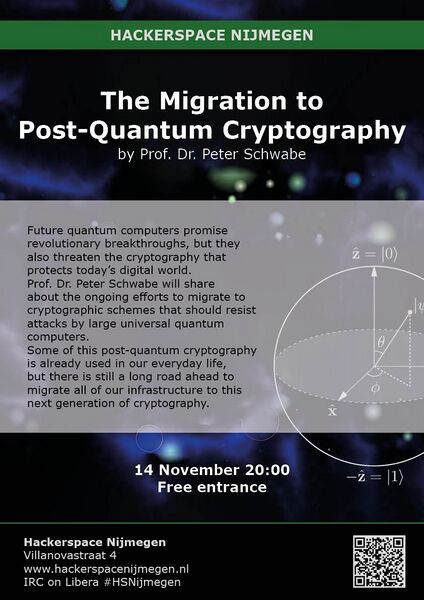 A poster with the most important information about the event 'The Migration to Post-Quantum Cryptography' on 14 November 2025 at Hackerspace Nijmegen. All information from the poster (and more) is also written on this event page.